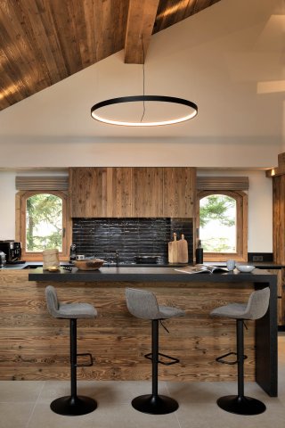 Le souhait des clients est de s’approprier pleinement les lieux sans dénaturer le chalet existant. Le travail de l’homogénéisation des différents bois intérieurs complété par le choix de matériaux avec une identité forte lient ce chalet authentique et la touche contemporaine insufflée par les clients.