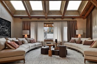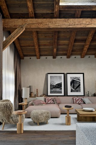 Les volumes intérieurs ont été conservés dans leur pleine hauteur, révélés par des ouvertures en toiture qui font de la lumière un véritable élément de composition. À cela s’ajoute la palette matérielle qui se resserre volontairement autour de trois éléments. Vieux bois, pierre et enduit à la chaux. Ce sont les trois matériaux du projet. Subtilement le granit du mont-Blanc affirme sa présence minérale brute, accueillant le foyer de la cheminée, rythmant certains seuils, soutenant des piliers porteurs avant de s’expri- mer pleinement, en rez-de-neige, au sein de l’espace wellness. Comme si le bassin avait été extrait d’un monolithe, façonné à la même époque que les murs.